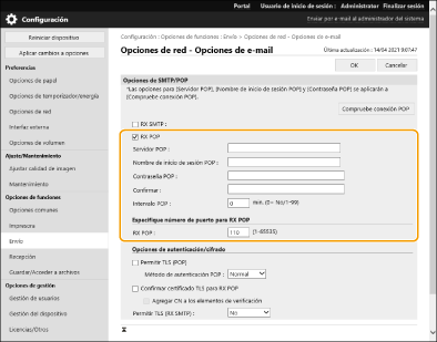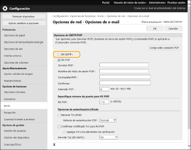 En esta sección se describe cómo especificar los ajustes de recepción e impresión de correos electrónicos en este equipo. Utilice un ordenador para especificar los ajustes de recepción de los correos electrónicos y el panel de control del equipo para especificar los ajustes de impresión de los correos electrónicos. Para poder configurar estas opciones hacen falta privilegios de Administrador.