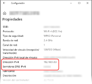 2 | En [Propiedades], consulte la dirección IP y el servidor DNS. |
