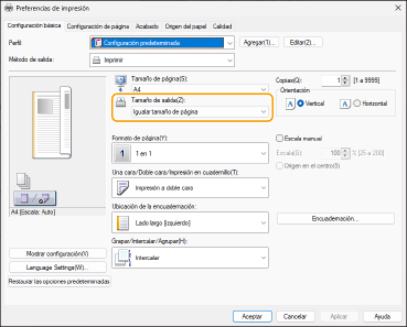 Haga coincidir [Tamaño salida] en el controlador de impresora con el tamaño de papel para imprimir.