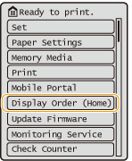 You can change settings regarding the screen display, such as which screen appears immediately after turning ON the machine, and whether the message appears for remaining paper and toner. <Display Settings> |