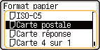 1 | Sélectionnez le type de cartes postales. | Si vous souhaitez imprimer sur les deux faces d'une carte postale, imprimez d'abord sur l'une des faces puis sur l'autre. Avant de charger les cartes postales, prenez soin de bien les aplatir. |