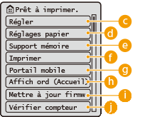 <Réglages de fonction>, <Préférences> et de nombreux autres réglages de l'appareil sont accessibles depuis ce bouton.