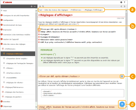 Cliquez ici pour spécifier des réglages tels que la taille du texte, la mise en page et la méthode d'affichage du Guide de l'utilisateur.