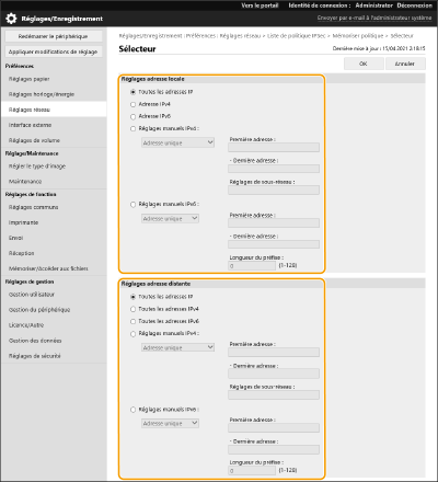 Gestion des politiques IPSecVous pouvez modifier les politiques sur l'écran affiché à l'étape 4. Pour modifier les détails d'une politique, cliquez sur le nom de la politique dans la liste. Pour désactiver une politique, cliquez sur le nom de la politique dans la liste, sélectionnez [Non] pour [Activer/désactiver politique] cliquez sur [OK].Pour supprimer une politique, sélectionnez-la dans la liste cliquez sur [Supprimer] [OK].Utilisation du panneau de commandeVous pouvez également activer ou désactiver la communication IPSec de <Régler> dans l'écran <Accueil>. <Réglages IPSec> Importation/exportation de lotsCe réglage peut être importé/exporté avec des modèles qui prennent en charge l'importation en lot de ce réglage. Import/Export des données de réglage Ce réglage est compris dans [Informations de base Réglages/Enregistrement] lors de l'export de lot. Import/Export de tous les réglages |