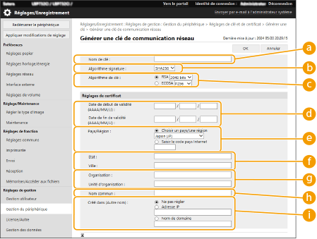 [Algorithme de clé]Sélectionnez [RSA] ou [ECDSA] comme algorithme de génération de clé. Sélectionnez la longueur de la clé si vous avez sélectionné [RSA] et le type de clé si vous avez sélectionné [ECDSA]. Dans les deux cas, une valeur plus élevée assure une plus grande sécurité mais réduit la vitesse de traitement des communications.