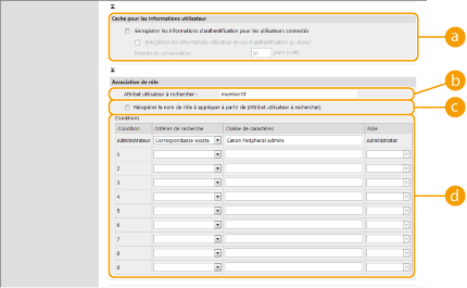[Chaîne de caractères] | Saisissez la chaîne de caractères enregistrée pour l'attribut spécifié dans [Attribut utilisateur à rechercher :]. Pour définir les privilèges en fonction du groupe auquel l'utilisateur appartient, saisissez le nom du groupe. |