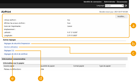 Si vous vous connectez en tant qu'administrateur, vous pouvez également modifier les réglages d'AirPrint depuis la page d'AirPrint.
