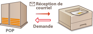 Lorsque la réception d’e-mail commence, tous les e-mails enregistrés dans la boîte aux lettres du serveur de messagerie sont imprimés. Si vous envoyez des e-mails à la machine, que vous souhaitez imprimer à l’avance, vous pouvez imprimer automatiquement les e-mails à intervalles réguliers ou imprimer tous les e-mails enregistrés à un moment arbitraire.