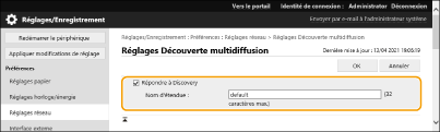 Sélectionnez [Répondre à Discovery], et spécifiez les réglages requis.