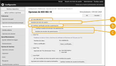 [Verificar nombre de servidor de autenticación]Para verificar el nombre común en el certificado del servidor, seleccione esta casilla de verificación e introduzca el nombre del servidor de autenticación en el que el usuario de inicio de sesión se encuentra registrado en [Nombre de servidor de autenticación].