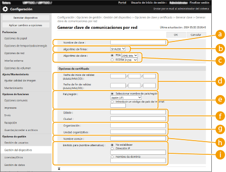 [Nombre común]Introduzca caracteres alfanuméricos para el nombre común del certificado según sea necesario. El “Nombre común” se suele abreviar como “CN”.