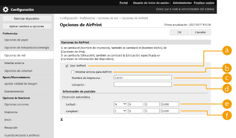 Si inicia sesión con privilegios de administrador, también puede cambiar las opciones de AirPrint desde la página para AirPrint.