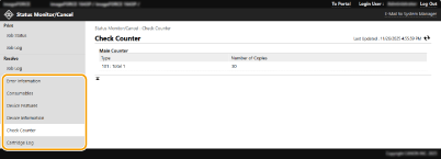 Você pode verificar a variedade de informações sobre a máquina, como informações de erro, a quantidade de papel e toner restante, informações sobre equipamentos opcionais conectados e o número total de páginas impresso até o momento.