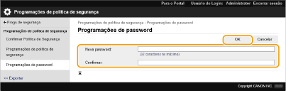 Digite a senha atual em [Password atual:] e clique em [OK] sem digitar nenhum valor para [Nova password:] ou [Confirmar:] (deixe-os em branco). Caso um limite de caracteres de entrada tenha sido configurado em [Política de Configurações de Senha], um valor deve ser digitado para esta configuração. Cancele o limite antes de remover a senha.