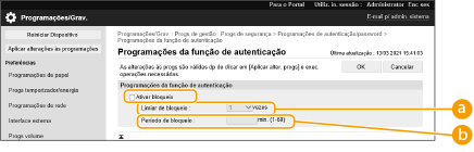 Você pode definir uma política para evitar temporariamente que um usuário que falhou na autenticação de usuário faça logon. No entanto, essa política não se aplica à autenticação que usa informações tais como IDs do departamento e PIN.