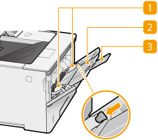 Adjust the paper guides to exactly the width of the loaded paper to ensure that paper is fed straight into the machine. Press the lock release lever that is marked with arrow in the illustration to release the lock and slide the paper guides.