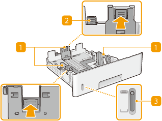 Adjust the paper guides to exactly the size of the loaded paper to ensure that paper is fed straight into the machine. Press the lock release levers that are marked with arrows in the illustrations to release the locks and slide the paper guides.