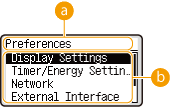 Setting items that belong to the current menu level are displayed in a list.