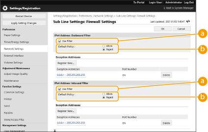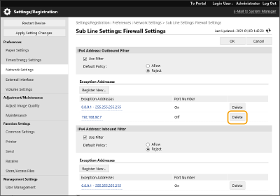 Only IPv4 addresses can be registered for the sub line. For information on the exception addresses and exception port numbers that can be used for communication and are registered by default, see Management Functions. |
