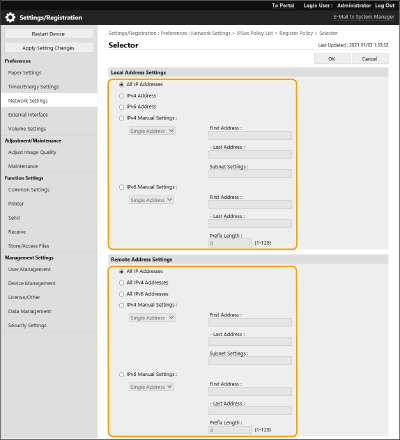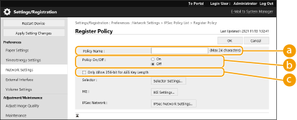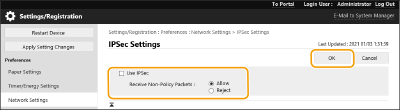 Managing IPSec policiesYou can edit policies on the screen displayed in step 4. To edit the details of a policy, click the policy name in the list. To disable a policy, click the policy name in the list select [Off] for [Policy On/Off] click [OK].To delete a policy, select the policy in the list click [Delete] [OK].Using the control panelYou can also enable or disable IPSec communication from <Set> in the <Home> screen. <IPSec Settings> Batch importing/batch exportingThis setting can be imported/exported with models that support batch importing of this setting. Importing/Exporting the Setting Data This setting is included in [Settings/Registration Basic Information] when batch exporting. Importing/Exporting All Settings |