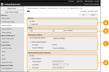 2 | Configure the necessary settings. ![]() [IKE Mode]Select the operation mode for the key exchange protocol. Security is enhanced if you select [Main] because the IKE session itself is encrypted, but the speed of the session is slower than with [Aggressive], which does not encrypt the entire session. [Validity]Set the expiration period of the generated IKE SA. [Authentication Method]Select one of the authentication methods described below.