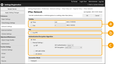 2 | Configure the necessary settings. ![]() [Validity]Set the expiration period of the generated IPSec SA. Make sure to set either [Time] or [Size]. If you set both, the setting with the value that is reached first is applied. [PFS]If you select [Use PFS], the secrecy of the encryption key is increased but communication speed is slower. In addition, the Perfect Forward Secrecy (PFS) function must be enabled on the communication peer device. [Authentication/Encryption Algorithm]Select either [Auto] or [Manual Settings] to set how to specify the authentication and encryption algorithm for IKE phase 2. If you select [Auto], the ESP authentication and encryption algorithm is set automatically. If you want to specify a particular authentication method, select [Manual Settings] and select one of the authentication methods below.