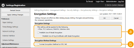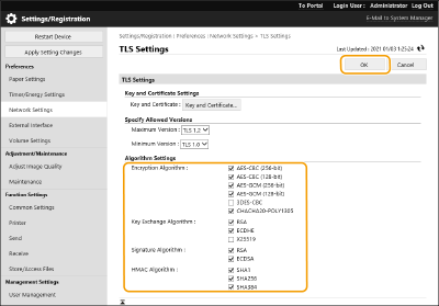 If you select [Format Encryption Method to FIPS 140], you can make the TLS communication encryption method comply with the United States government-approved FIPS (Federal Information Processing Standards) 140, but the following limitations apply. An error will occur if you specify a certificate for TLS that uses an algorithm not recognized by FIPS (lower than RSA2048bit). A communication error will occur if the communication destination does not support FIPS-recognized encryption algorithms. [CHACHA20-POLY1305] and [X25519] can no longer be used. Batch importing/batch exportingThis setting can be imported/exported with models that support batch importing of this setting. Importing/Exporting the Setting Data This setting is included in [Settings/Registration Basic Information] when batch exporting. Importing/Exporting All Settings |