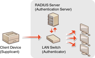 If a device tries to connect and start communicating on an 802.1X network, the device must go through user authentication in order to prove that the connection is made by an authorized user. Authentication information is sent to and checked by a RADIUS server, which permits or rejects communication to the network depending on the authentication result. If authentication fails, a LAN switch (or an access point) blocks access from the outside of the network. The machine can connect to an 802.1X network as a client device.