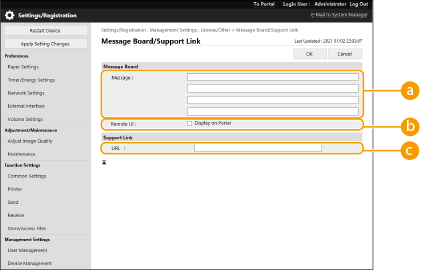 | | You can display messages to users on the portal page of the Remote UI. Administrator privileges are required in order to configure these settings. |