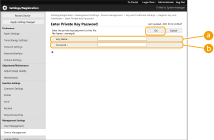 Keys and certificates (server certificates) can be registered via the Remote UI. For information on the keys and certificates that can be registered on the machine, see