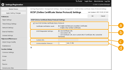 There are two methods for verifying whether certificates received from the other party in communication are valid: Comparing with the certificate revocation list (CRL) registered in the machine and querying an OCSP (online certificate status protocol) responder (a server that supports OCSP). Set the method for checking the expiration of certificates according to your environment. This registration can only be performed by the administrator.