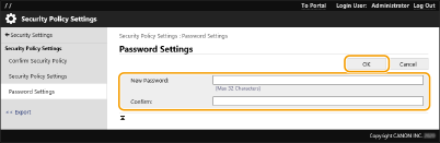 Enter the current password in [Current Password:], and click [OK] without entering any value for [New Password:] or [Confirm:] (leave them blank). If an input character limit has been configured in [Password Settings Policy], a value must be entered for this setting. Cancel the limit before removing the password.