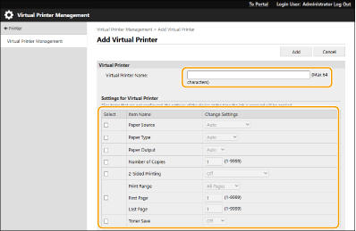 ![]() | A virtual printer enables you to use LPD printing or FTP printing with the print settings registered as a virtual printer in advance. For example, registering settings such as the paper type, number of copies, and two-sided printing in advance eliminates the need to specify these settings for each job. |