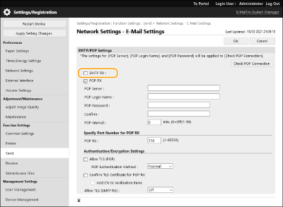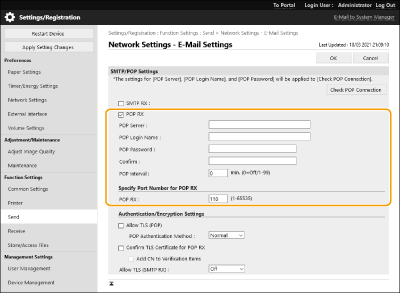 Select the check box to enable E-Mail Print from the POP mail server. You can also specify this setting by using <Use POP RX> in the setting menu of the control panel.