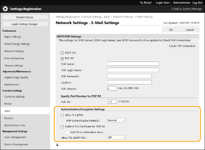 Select the check box to confirm whether the TLS server certificate is valid when receiving with POP. The machine verifies that the certificate has not expired or been revoked and checks the certificate chain for problems.