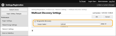 Select the check box to set the machine to respond to device management software multicast discovery packets and enable monitoring by device management software.