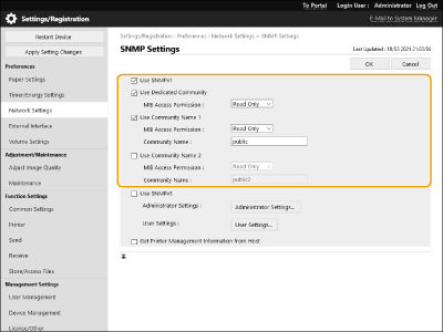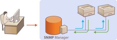 Simple Network Management Protocol (SNMP) is a protocol for monitoring and controlling communication devices in a network by using Management Information Base (MIB). The machine supports SNMPv1 and security-enhanced SNMPv3. You can check the status of the machine from a computer when you print documents or use the Remote UI. You can enable either SNMPv1 or SNMPv3, or both at the same time. Specify the settings for each version to suit your network environment and the purpose of use.