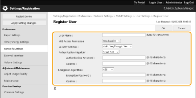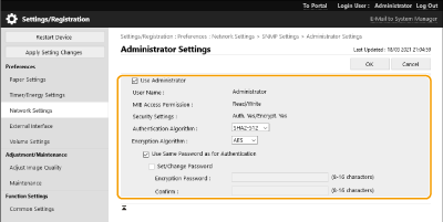 1 | Click [Administrator Settings]. [Use Administrator] Select the check box to use the Administrator user. [Authentication Algorithm] and [Encryption Algorithm] cannot be changed. [Use Same Password as for Authentication] Select the check box to use the same password as the password used in user authentication. |