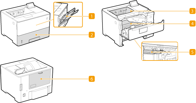 For information on the paper jam locations and the method for clearing paper jams, see the following diagram and references.