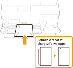 Chargez les enveloppes en orientation portrait (avec le bord court vers l'appareil), face non encollée (avant) vers le bas. Vous ne pouvez pas imprimer sur la face arrière des enveloppes.