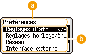 Sélectionnez <Régler> pour afficher l'écran <Menu>. De nombreux paramètres de la machine, tels que les paramètres de gestion, les paramètres d'affichage et les paramètres réseau, sont configurés en premier lieu en sélectionnant <Régler>.