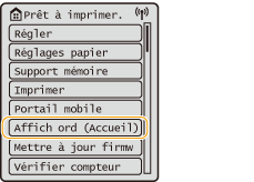 (Accueil). L'écran <Accueil> ou l'écran des réglages apparaît sur l'affichage, ce qui vous permet de lancer des fonctions telles que <Support mémoire> et <Portail mobile>. Vous pouvez également utiliser l'affichage pour vérifier des informations telles que des messages d'erreur et l'état de fonctionnement de la machine.