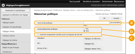 Gestion des politiques IPSecVous pouvez modifier les politiques sur l'écran affiché à l'étape 4. Pour modifier les détails d'une politique, cliquez sur le nom de la politique dans la liste. Pour désactiver une politique, cliquez sur le nom de la politique dans la liste, sélectionnez [Non] pour [Activer/désactiver politique] cliquez sur [OK].Pour supprimer une politique, sélectionnez-la dans la liste cliquez sur [Supprimer] [OK].Utilisation du panneau de commandeVous pouvez également activer ou désactiver la communication IPSec de <Régler> dans l'écran <Accueil>. <Réglages IPSec> Importation/exportation de lotsCe réglage peut être importé/exporté avec des modèles qui prennent en charge l'importation en lot de ce réglage. Import/Export des données de réglage Ce réglage est compris dans [Informations de base Réglages/Enregistrement] lors de l'export de lot. Import/Export de tous les réglages |
