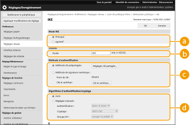 Mode de communicationCet appareil ne prenant en charge que le mode de transport pour les communications IPSec, l'authentification et le cryptage ne sont appliqués qu'aux parties de données des paquets IP. Protocole d'échange de clésCet appareil prend en charge Internet Key Exchange version 1 (IKEv1) pour l'échange de clés basé sur l'Internet Security Association et le Key Management Protocol (ISAKMP). Pour la méthode d'authentification, sélectionnez la méthode de la clé pré-partagée ou la méthode de la signature numérique. Pour configurer la méthode de la clé pré-partagée, vous devez choisir une phrase de passe (clé pré-partagée) à l'avance, qui est utilisée entre la machine et l'homologue de communication IPSec. Pour configurer la méthode de signature numérique, utilisez un certificat, une clé et un certificat au format PKCS#12 pour l'authentification mutuelle entre l'appareil et l'homologue de communication IPSec. Pour en savoir plus sur l'enregistrement de nouveaux certificats ou d'associations clés-certificats, consultez la section Enregistrement de la clé et du certificat pour les communications réseau. Notez que, pour que l'appareil utilise cette méthode, le protocole SNTP doit y être configuré. Réglages SNTP |