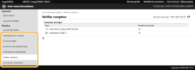Vous pouvez vérifier diverses informations sur la machine, comme des informations d'erreur, la quantité restante de papier et d'encre, des informations sur l'équipement optionnel relié et le nombre total de pages qui ont été imprimées jusqu'à maintenant.