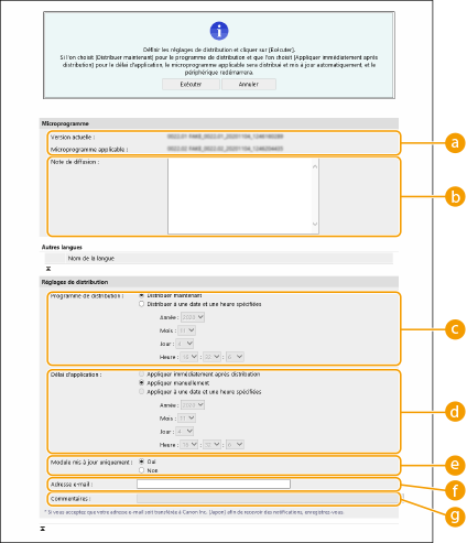 Pour télécharger le microprogramme immédiatement, sélectionnez [Distribuer maintenant]. Pour télécharger automatiquement le microprogramme à une date et une heure prédéfinies, sélectionnez [Distribuer à une date et une heure spécifiées], puis définissez la date et l'heure dans [Année :]/[Mois :]/[Jour :]/[Heure :]. Vous pouvez fixer une date et une heure situées dans la semaine à venir.