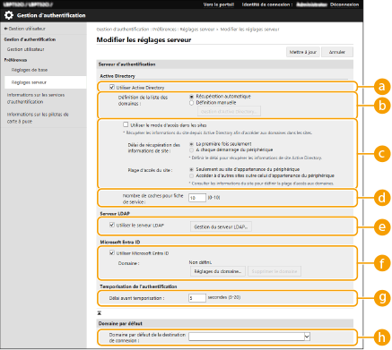 4 | Saisissez les informations nécessaires. ![]() [Nom de domaine :]Saisissez le nom de domaine de l'Active Directory destinataire de connexion (exemple : entreprise.domaine.fr). [Nom NetBIOS]Saisissez le nom de domaine NetBIOS (exemple : entreprise). [Nom de l'hôte principal ou adresse IP :] / [Nom de l'hôte secondaire ou adresse IP :]Saisissez le nom d'hôte du serveur Active Directory ou l'adresse IPv4. Si vous utilisez un second serveur, spécifiez le nom dans [Nom de l'hôte secondaire ou adresse IP :]. Exemple : En utilisant un nom d'hôte : ad-server1 En utilisant une adresse IPv4 : 192.168.18.138 [Nom d'utilisateur :] / [Mot de passe :]Saisissez le nom d'utilisateur et le mot de passe à utiliser pour accéder au serveur Active Directory et le rechercher. [Point de départ de la recherche :]Spécifiez l'emplacement d'accès et de recherche dans le serveur Active Directory. [Nom de connexion :] / [Affiché comme] / [Adresse e-mail :]Spécifiez les champs de données (noms d'attribut) pour le nom de connexion, le nom d'affichage et l'adresse e-mail de chaque compte d'utilisateur sur le serveur Active Directory (Exemple : sAMAccountName, cn, mail). |