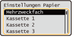 Wenn das angezeigte Papierformat/der Papiertyp sich vom eingelegten Papierformat/Papiertyp unterscheidet, wählen Sie <Einstellungen Papier> und die Papierzufuhr in der das richtige Papier eingelegt ist.