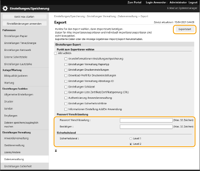 Zum Verschlüsseln aller Einstellungsdaten wählen Sie [Level 2] in [Sicherheitslevel].