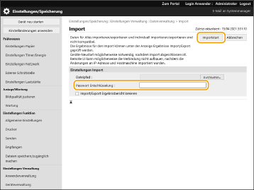 Geben Sie in [Passwort Entschlüsselung] das gleiche Passwort ein, das beim Exportieren der Einstellungsdaten eingegeben wurde.